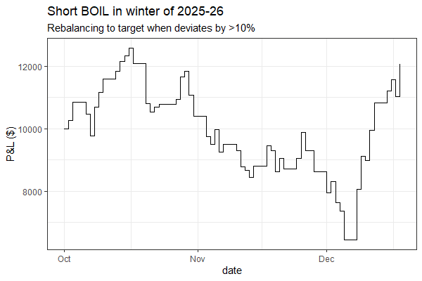 The trade is simple: short natural gas futures around the winter months. I like to express it as a short position in BOIL, the 2x leveraged natural gas ETF.