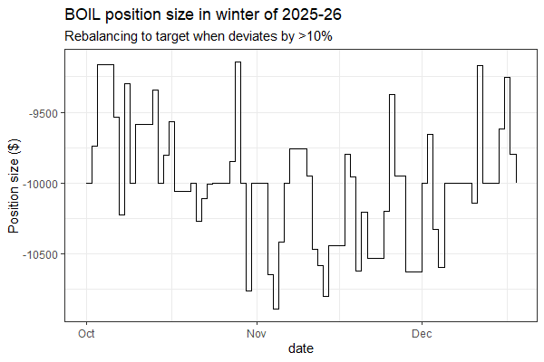 On the other hand, here’s the position size over time with rebalancing: