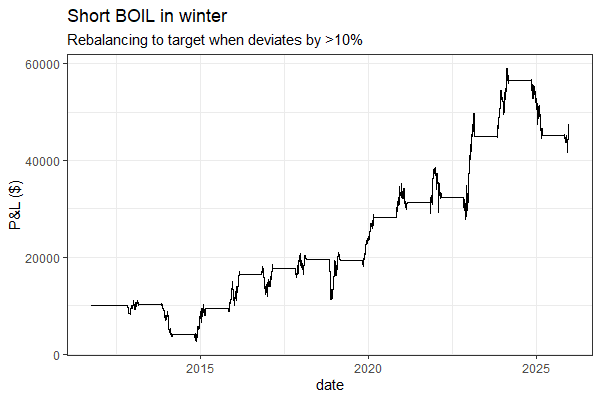 It’s a seasonality play, but you also get exposed to a nice basis decay tailwind. Natural gas futures curves are usually steep, and the front months, which BOIL is most exposed to, tend to deliver consistent roll-down. You also get exposed to the frictions of a leveraged ETF: tracking error, volatility drag. All working in your favour when you’re short.