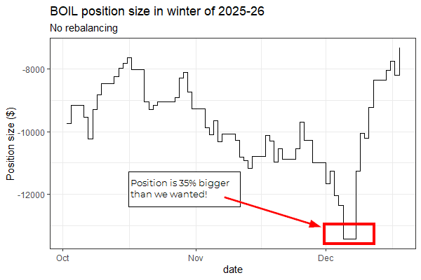 It’s always tempting to do the thing that maximises returns in the backtest. But in the case of rebalancing a volatile position, that’s making two mistakes: