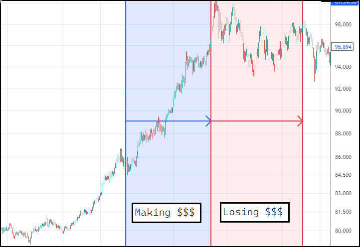 Here’s a chart of the US Dollar Index during that period. The blue shading is when I made money. The red shading is when I lost it: